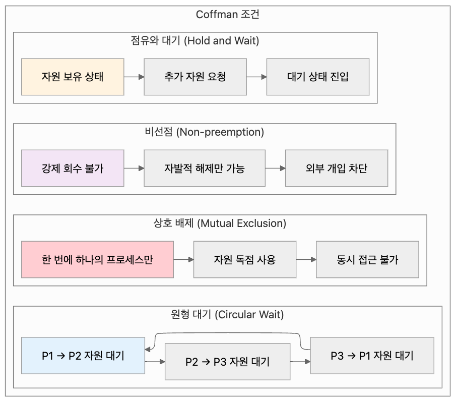 교착 상태가 발생하기 위해서는 다음 네 가지 조건이 동시에 성립해야 합니다. 이러한 조건들을 Coffman 조건이라고도 합니다.