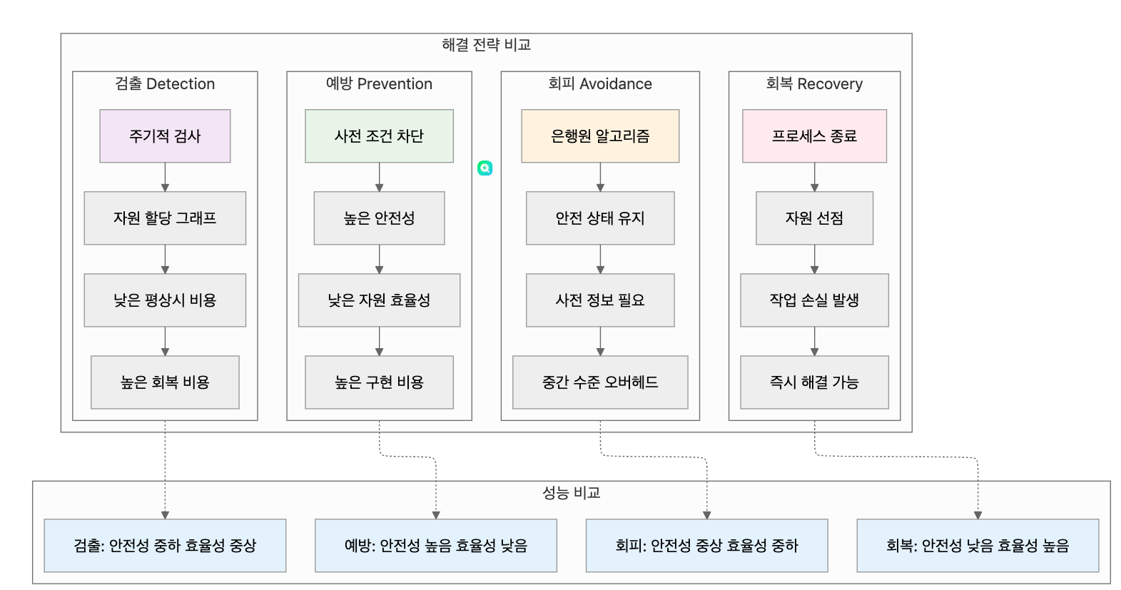 각 교착 상태 해결 방법은 서로 다른 성능 특성을 보입니다: